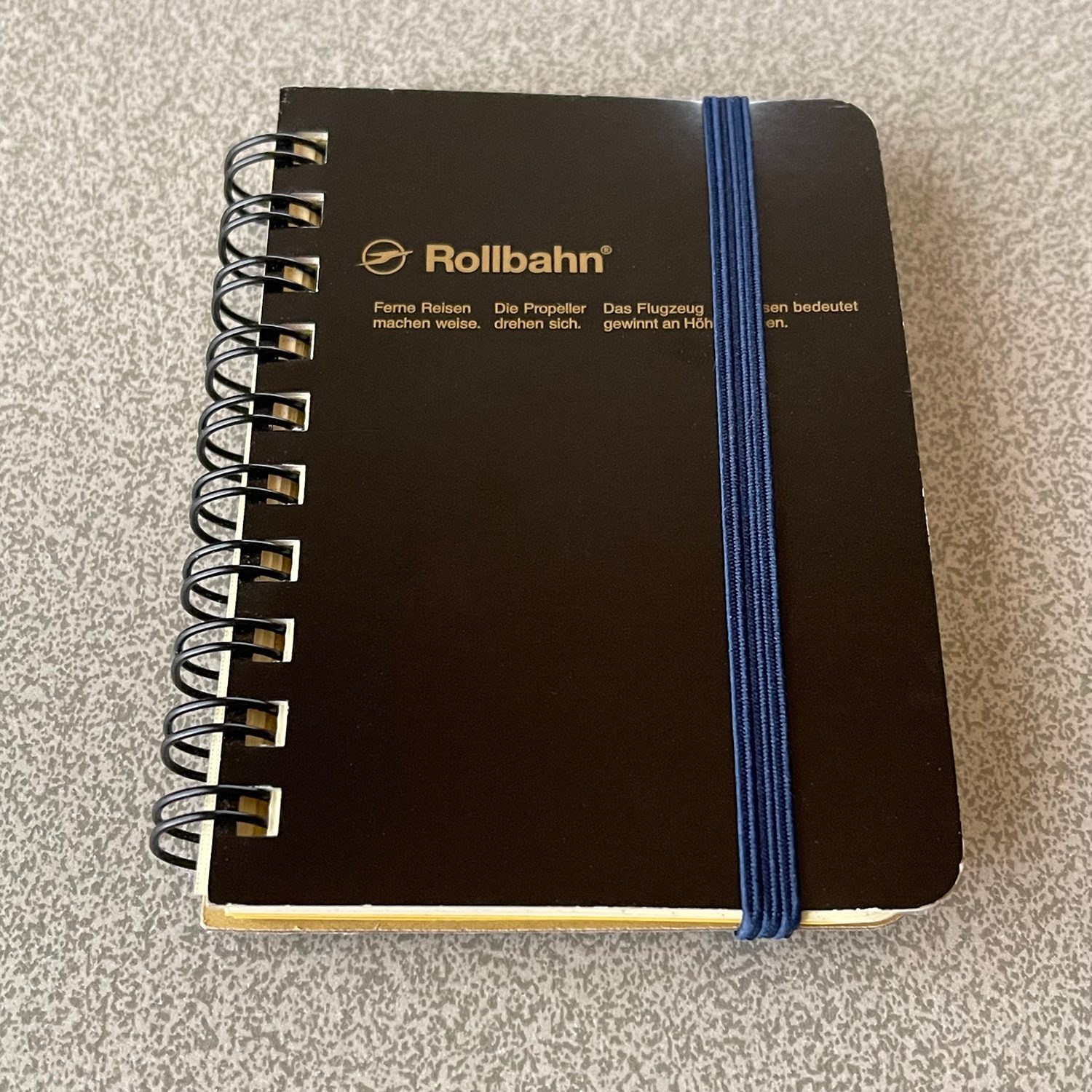 持ち歩いているメモ帳はロルバーンのミニサイズです。画像だと分かりづらいですが、サイズ感がポケカとかが入るサイズです。紺のゴムバンドがとても好き。