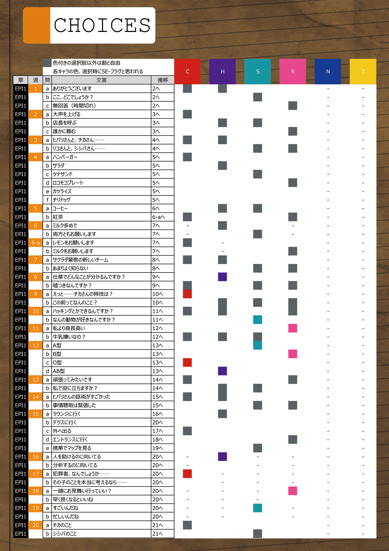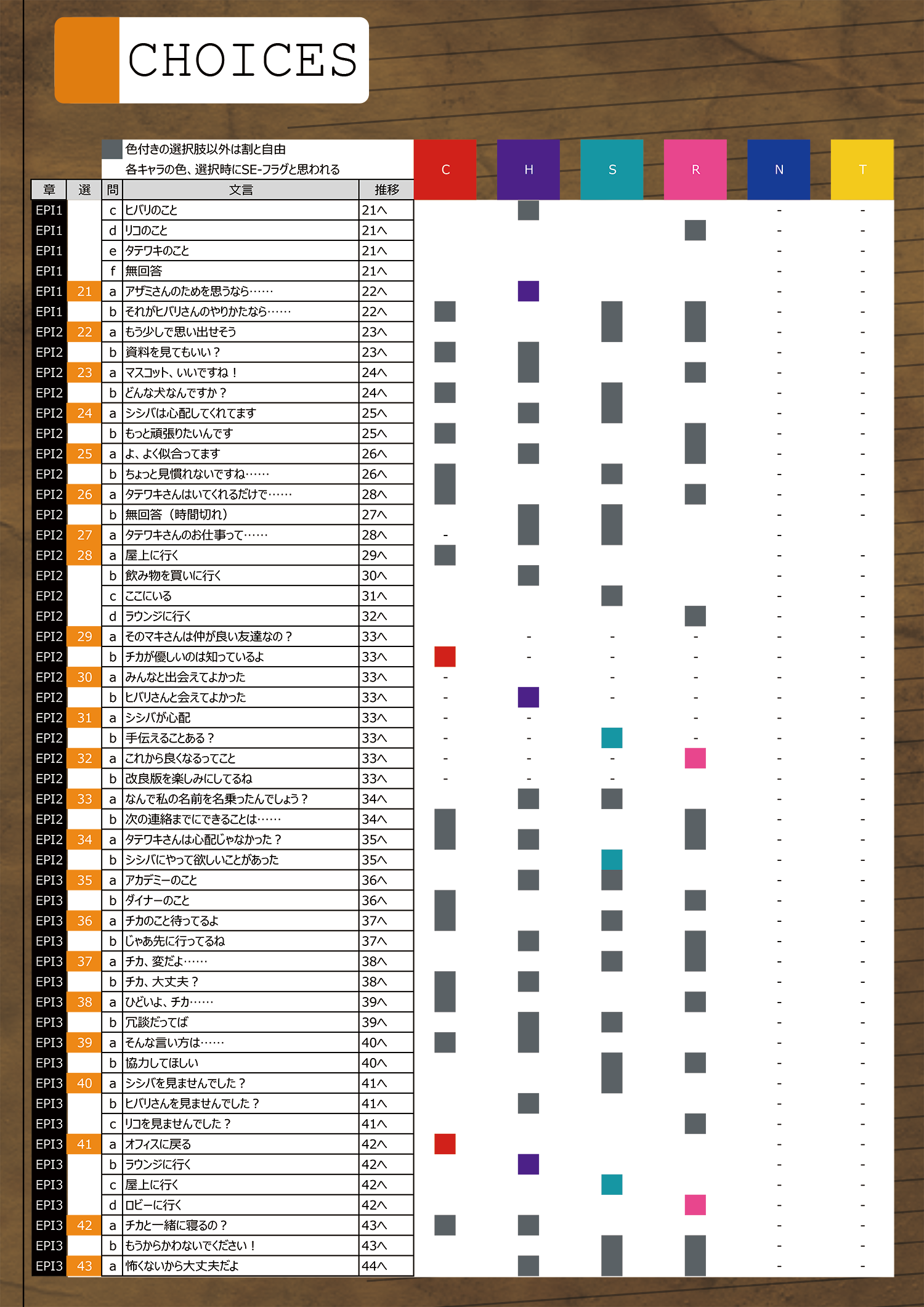 ストーリー中に登場する選択肢の一覧。キャラクターカラーの選択肢を基本的にはそのキャラのルートに進む事ができる。