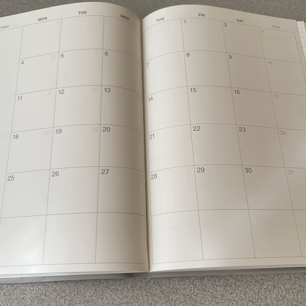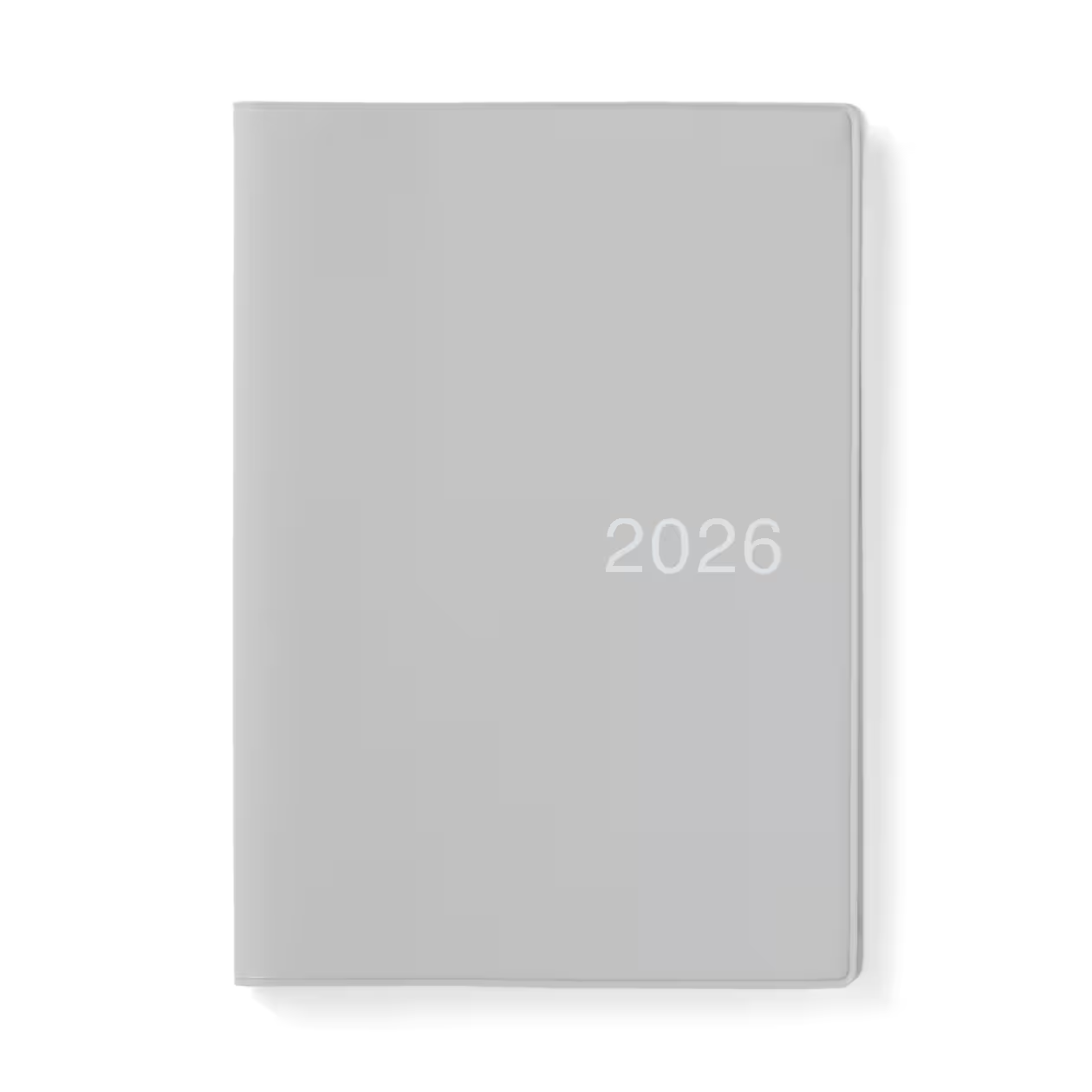六輝・祝日・月齢表記を省き、シンプルに仕上げたスケジュールノートです。月曜日始まりの見開き1ヶ月と週間レフトタイプ(見開き左は1週間・右は方眼フリースペース)、方眼フリーページと、しおり紐付きです。