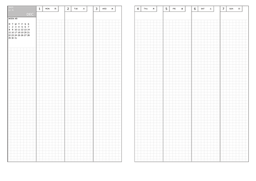 バーチカルページは一番左の空きスペースにウィークリーミッション、週1でもらえるアイテム。デイリーの枠にはその日の最終パスランク、デイリーミッションと、ログインボーナスの一覧、余ったスペースでその週に登場した新しいSSRカードの効果と内容を書いてます。書くと覚えるからこれ書きながら編成考えたり、必要枚数から消費ジェムの計算をしている。