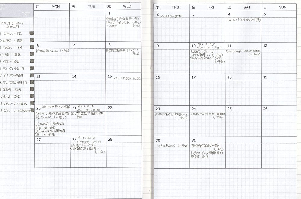 で、下の余ったスペースでその日にこなしたいToDoを書いてます。インフォメーションで案内された当日限定の引き換えアイテムだったり、ミニゲームの消化状況とかをメモしておいて、こなしたら塗りつぶしています。この週は全部埋まってるけど、ランク上げ終えた後とかはキラースクラッチとフィールドワークサボりがち←